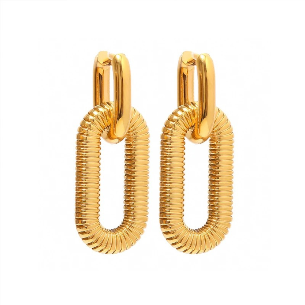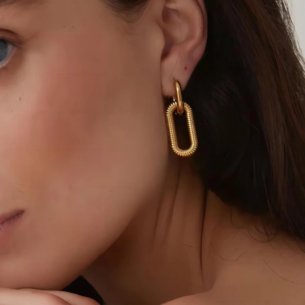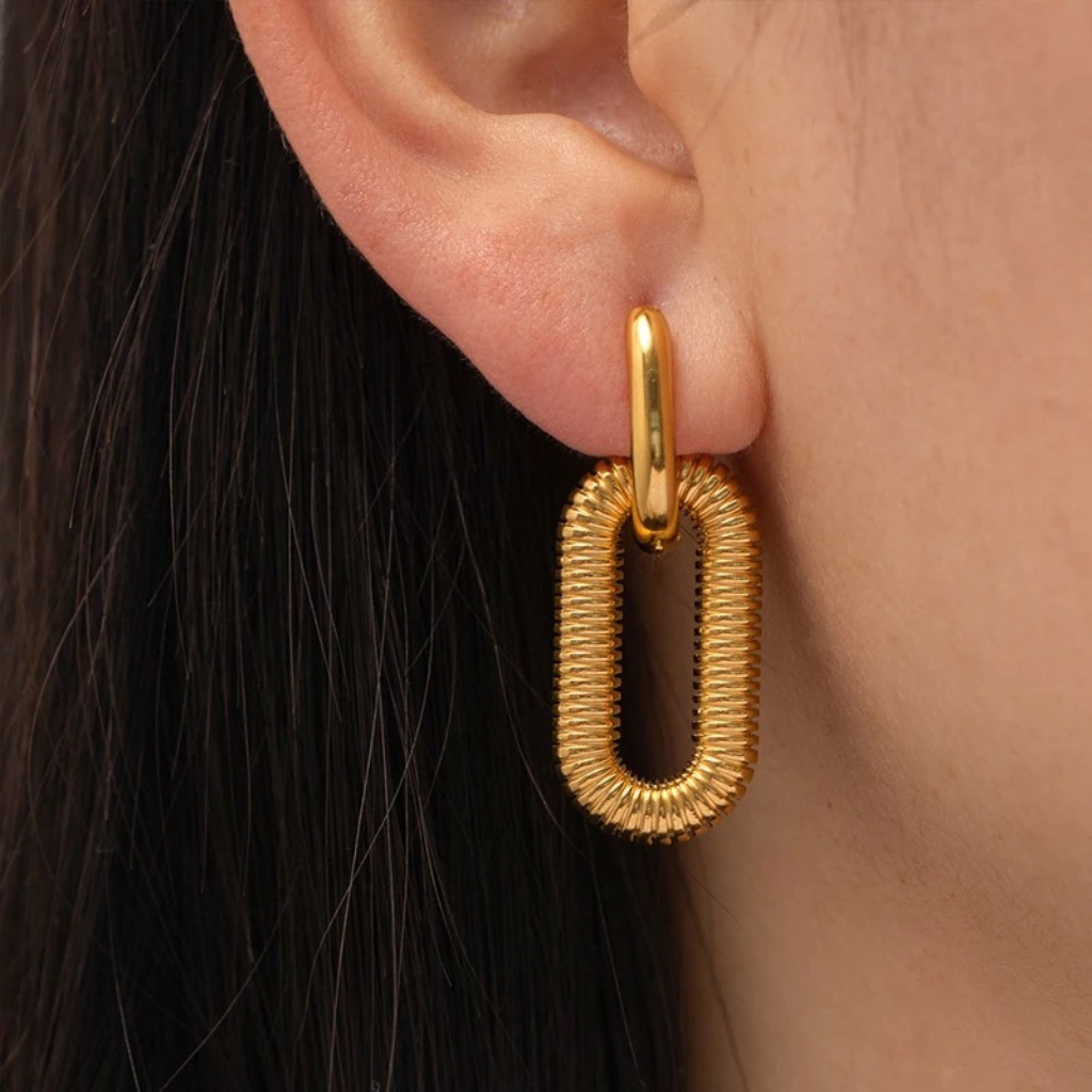 Bruselas es un aro moderno y elegante con un diseño alargado tipo eslabón. Su textura marcada y su acabado dorado brillante lo convierten en una pieza llamativa pero sofisticada, perfecta para elevar un look simple o complementar un outfit más arreglado.
