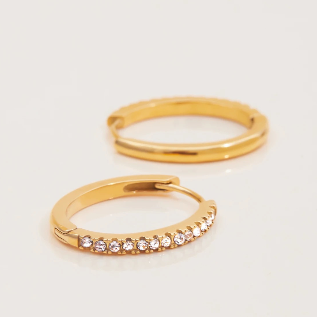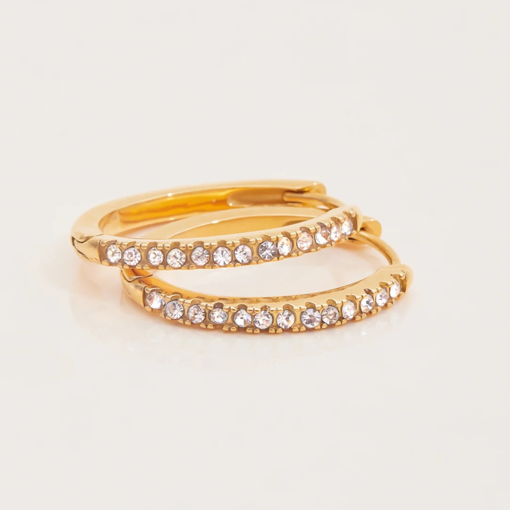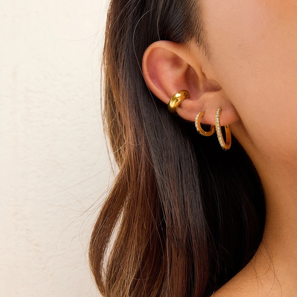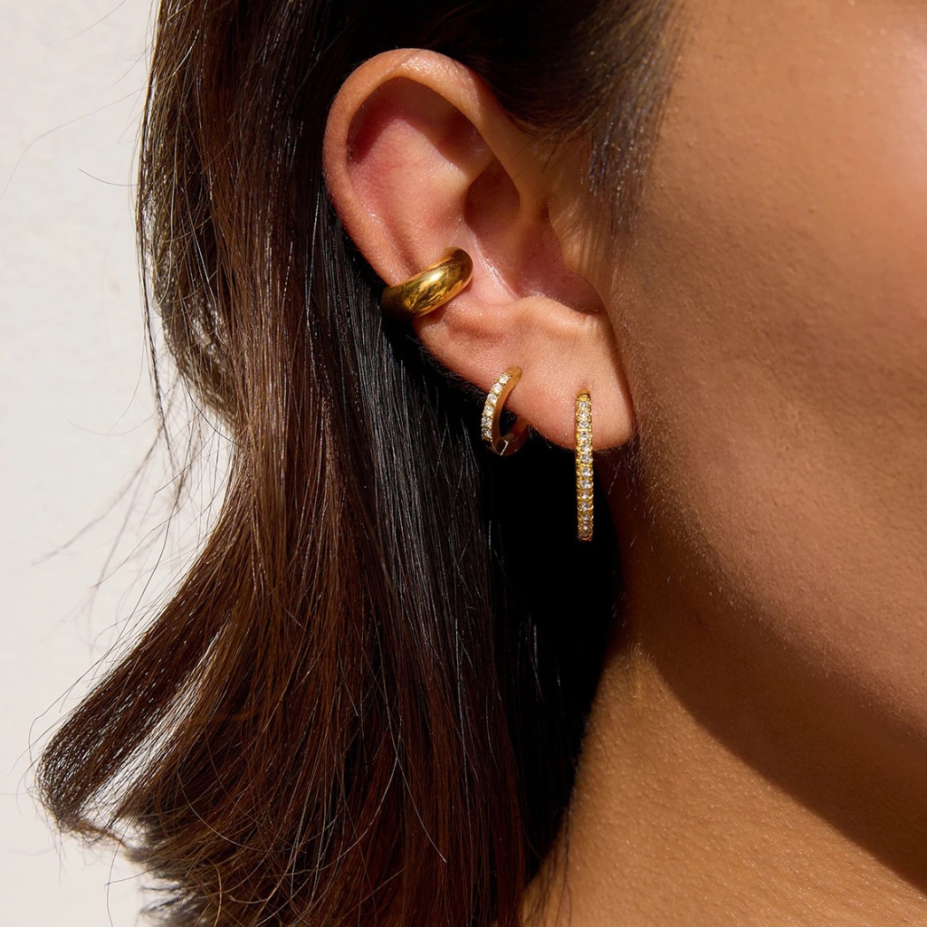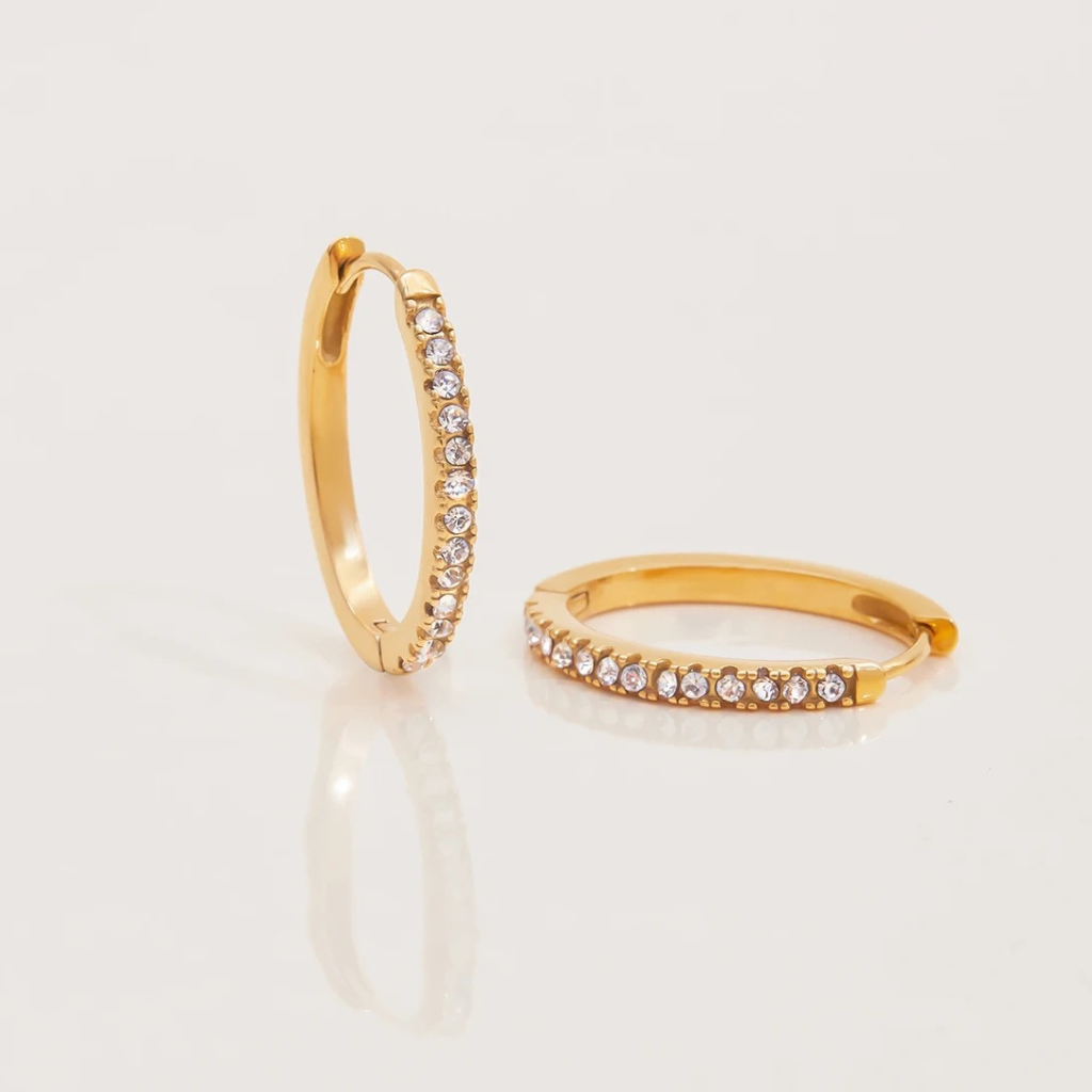 Su estructura delgada, adornada con circonias cúbicas en todo el frente, crea un brillo limpio y cristalino que se ve increíble tanto solo como combinado con otros aros en layering. Son ese tipo de pieza que eleva cualquier look —desde un outfit playero a uno más formal de noche— sin esfuerzo.