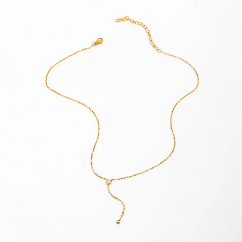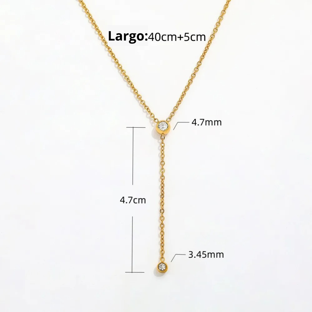 Un diseño minimalista y elegante que destaca por su delicado colgante en forma de lágrima, adornado con dos sutiles incrustaciones de cristales brillantes. Este collar tipo Y resalta la línea del cuello, aportando un toque sofisticado y refinado a cualquier look. Fabricado en materiales resistentes al agua, el Collar Cusco es perfecto para el uso diario, combinando estilo y practicidad. Ideal para quienes buscan un accesorio versátil que complemente tanto atuendos casuales como elegantes, con un aire moderno y distinguido.