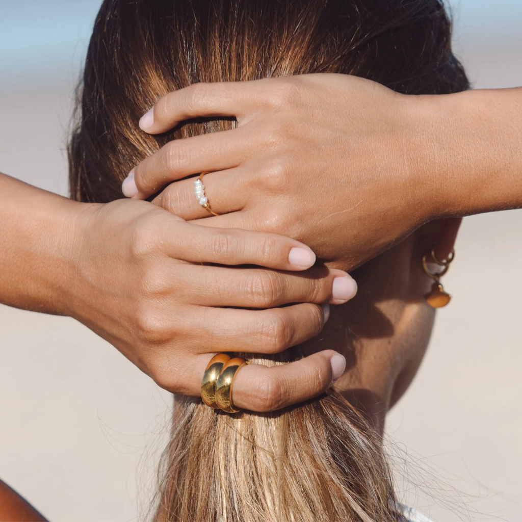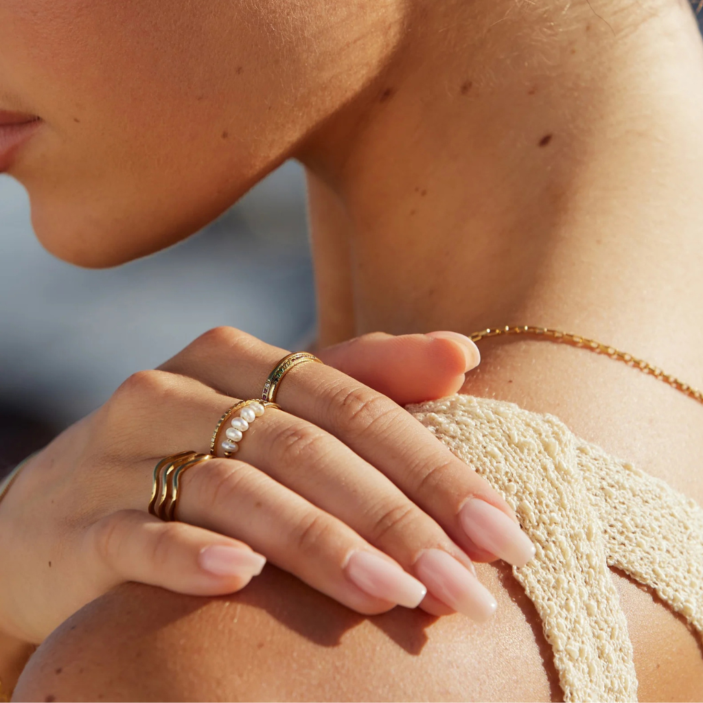 Anillo Dani de perlas: delicado pero con carácter. Presenta una hilera de cinco mini perlas de agua dulce seleccionadas a mano por su brillo y calidad; crean un destello sutil que realza cualquier look.