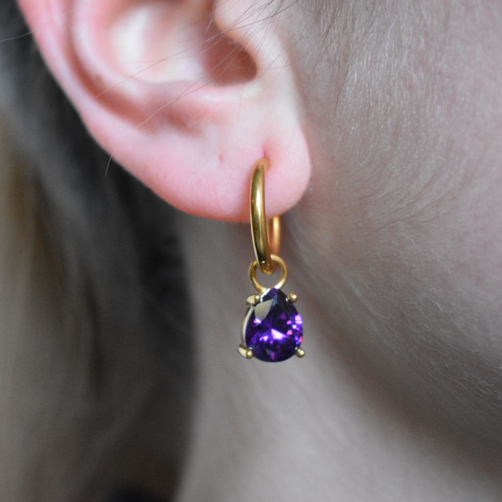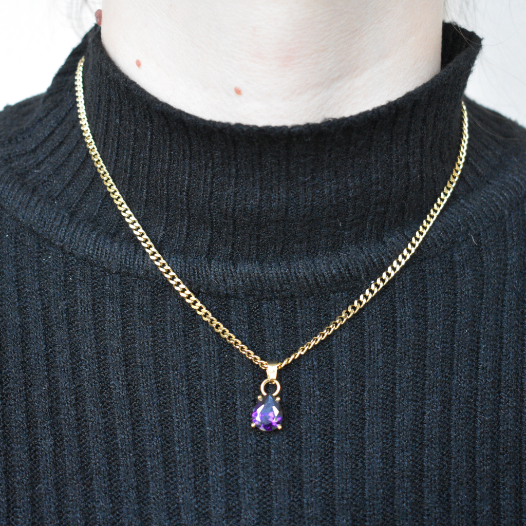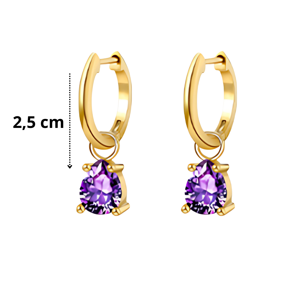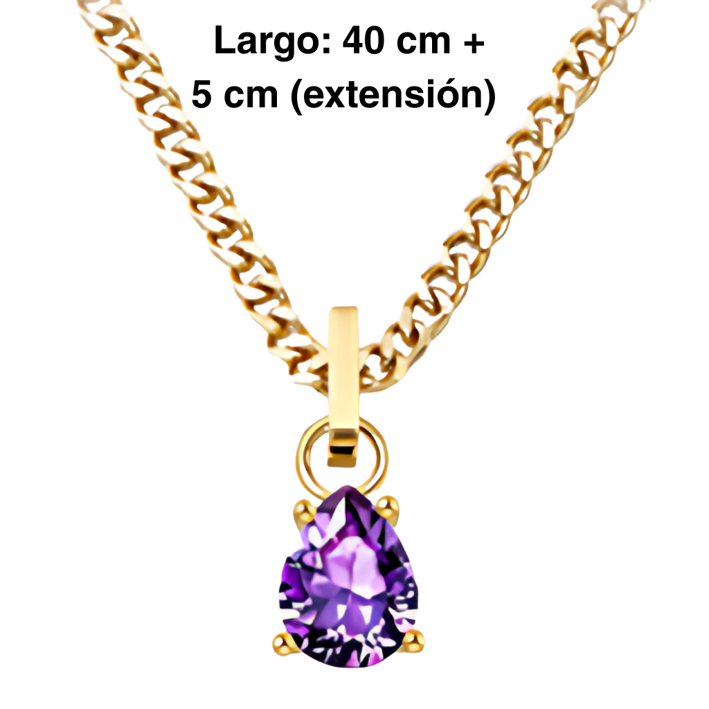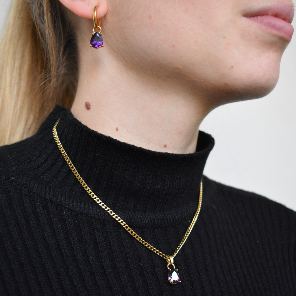 Luce el poder del color con este set compuesto por una cadena de 40 cm + 5 cm de extensión y aros de 2,5 cm, ambos bañados en oro y decorados con un vibrante cristal púrpura en forma de gota. El tono profundo del cristal aporta elegancia y carácter, creando una joya impactante y sofisticada.