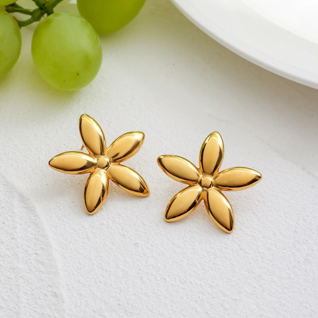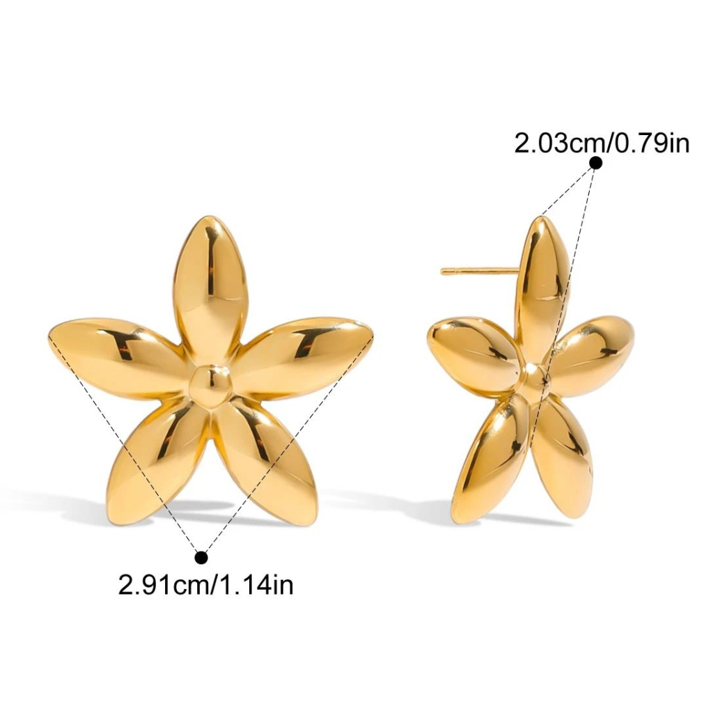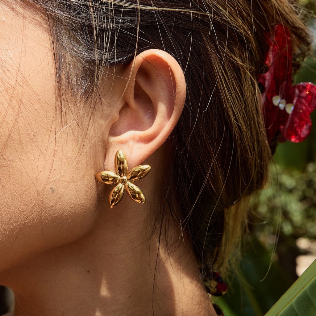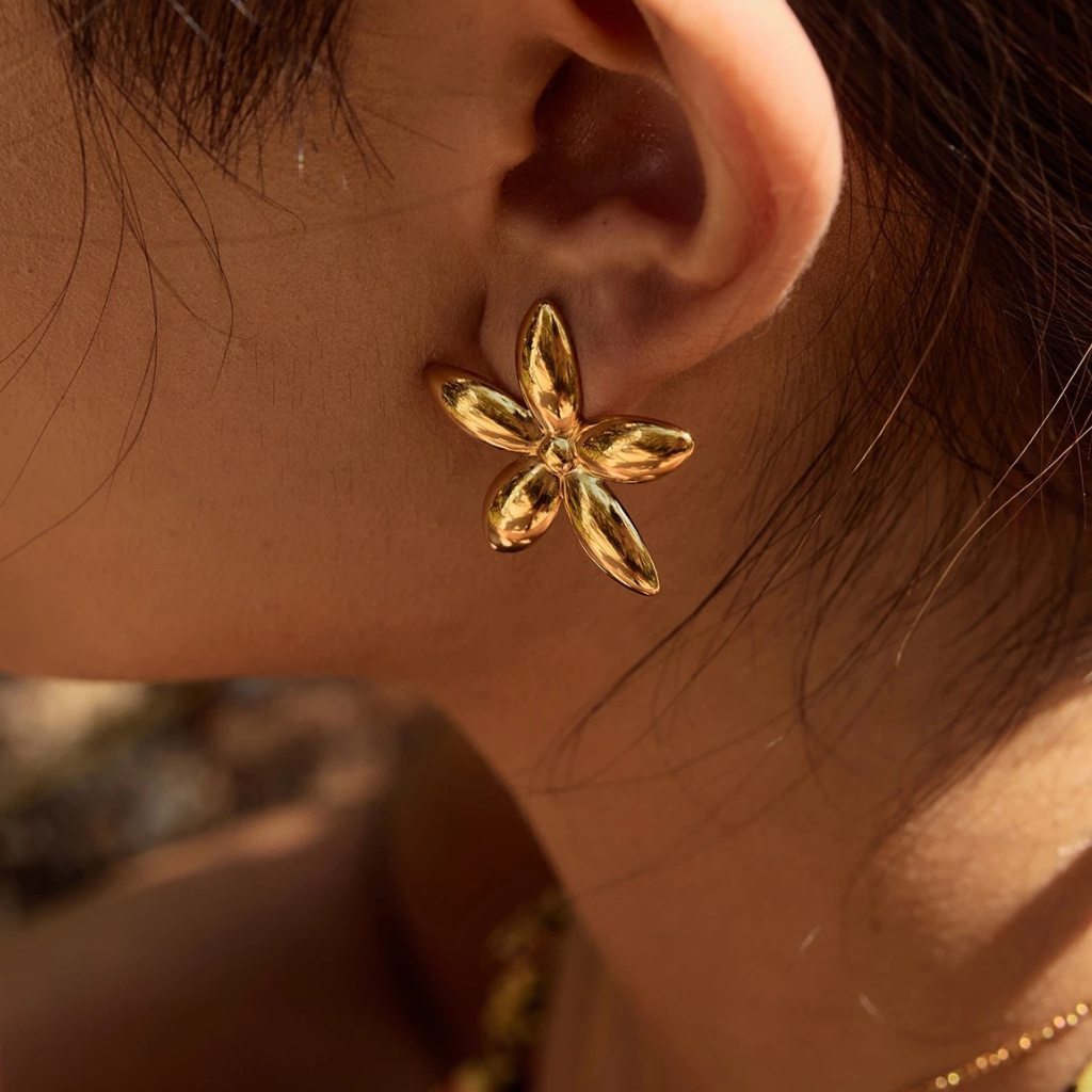 Inspirados en la belleza natural y la calidez veraniega, los Aros Florencia combinan volumen, brillo y un diseño orgánico que ilumina inmediatamente el rostro. Su forma de flor de cinco pétalos, pulida a espejo, crea un efecto radiante y femenino que transforma cualquier look —desde el más casual hasta uno elegante para la noche.