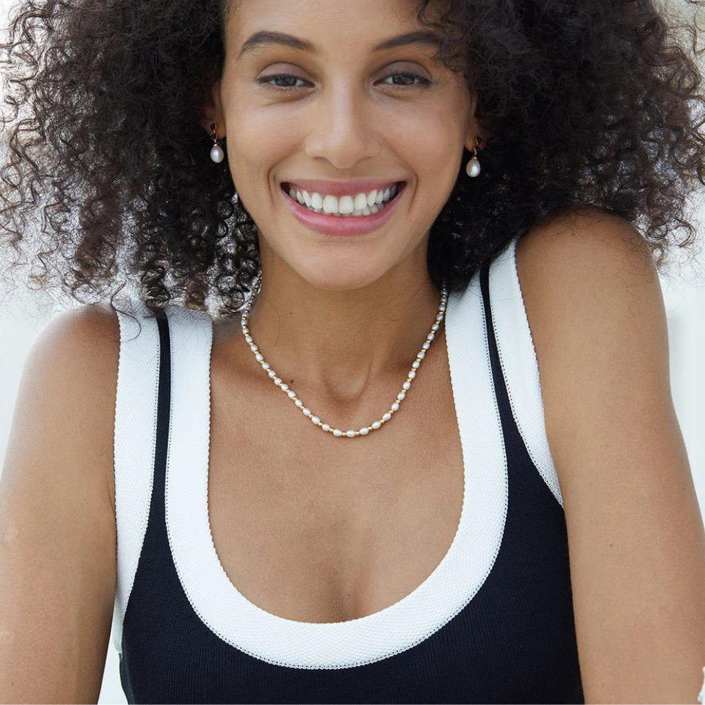 Adornado con perlas naturales de agua dulce, cada una con forma única e irregular, es el accesorio perfecto tanto para días de playa como para noches en la ciudad.