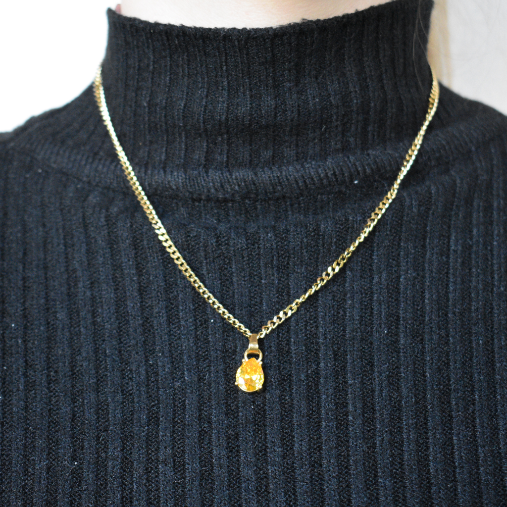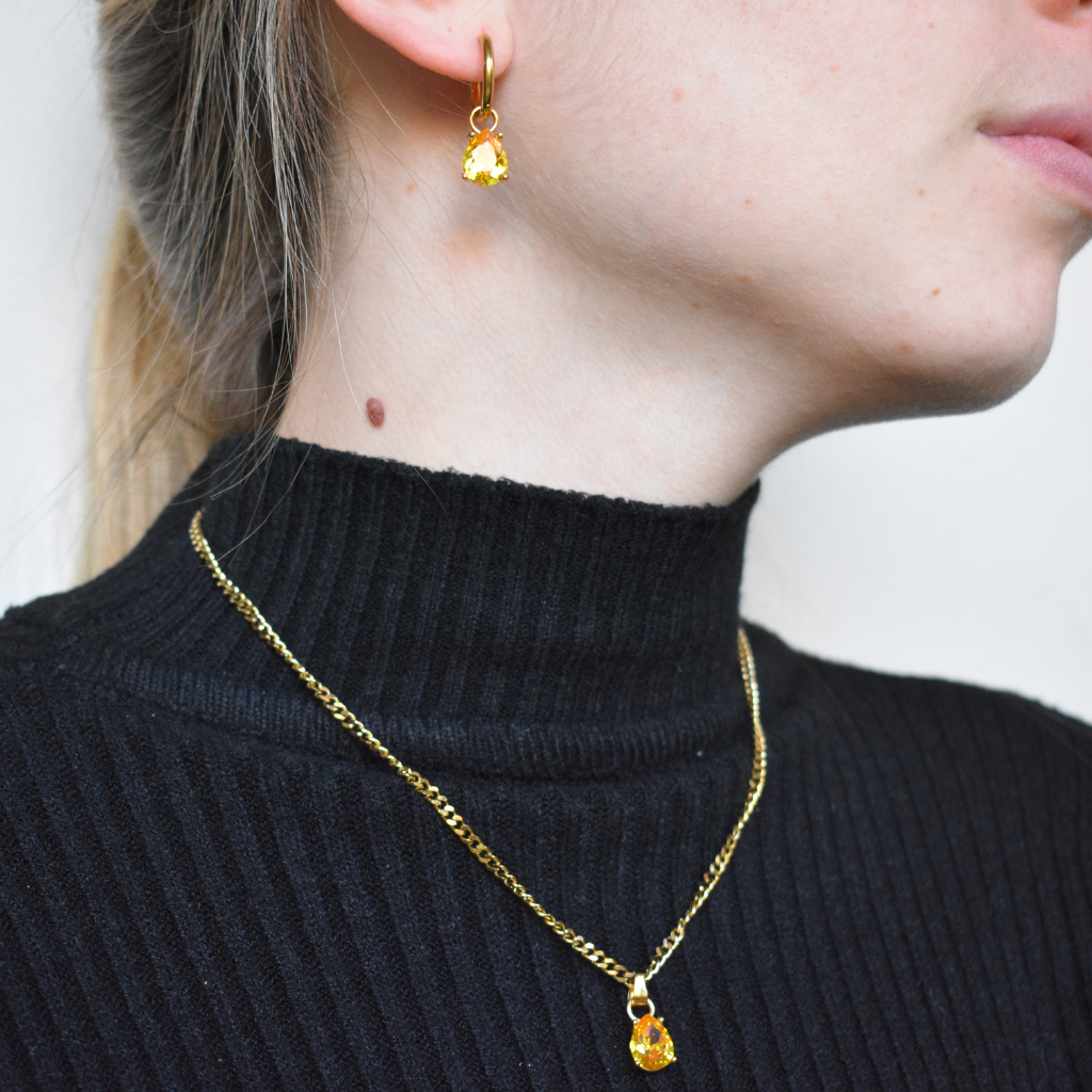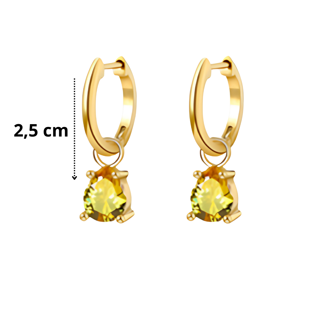 Brilla con luz propia con este set compuesto por una cadena de 40 cm + 5 cm de extensión y aros de 2,5 cm, ambos bañados en oro y decorados con un cristal en tono oro miel, que evoca la calidez del sol y aporta un brillo natural y sofisticado.
