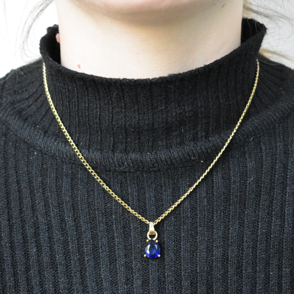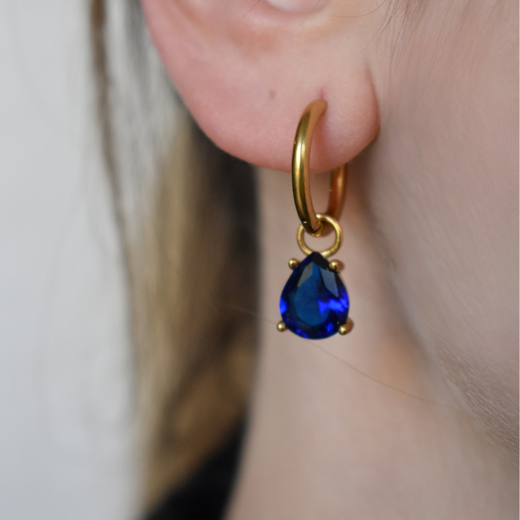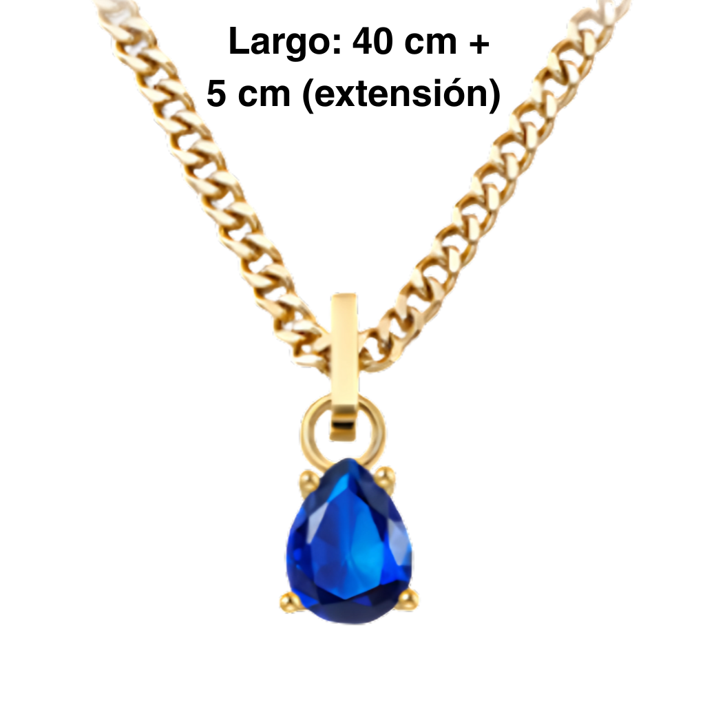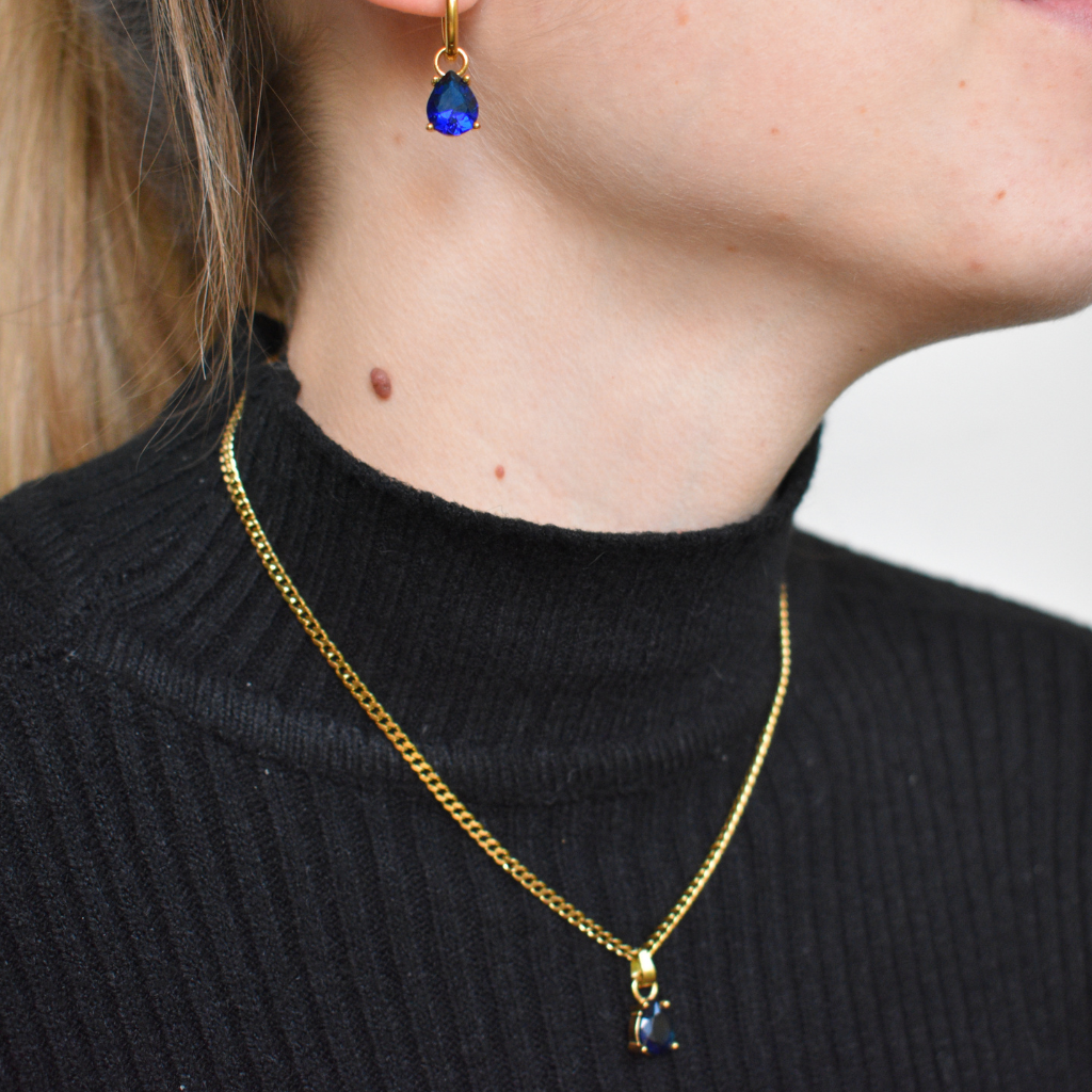 Este set combina elegancia atemporal y fuerza en cada detalle. Con una cadena de 40 cm + 5 cm de extensión y aros de 2,5 cm de diámetro, ambos bañados en oro, destaca por su imponente cristal azul zafiro en forma de gota, que aporta un brillo profundo y sofisticado.
