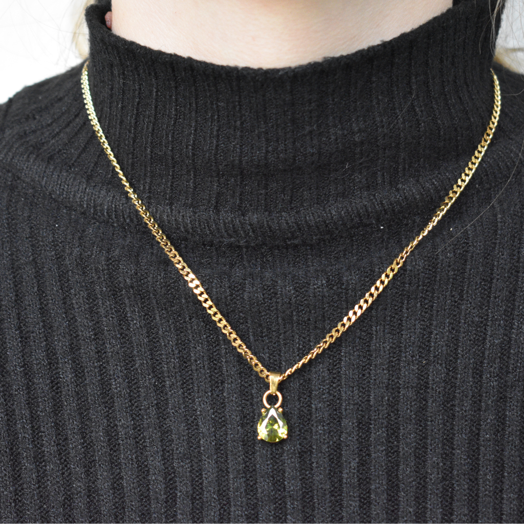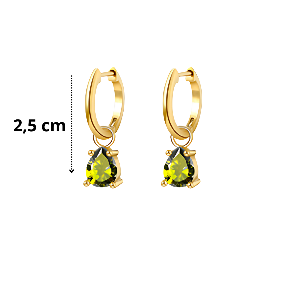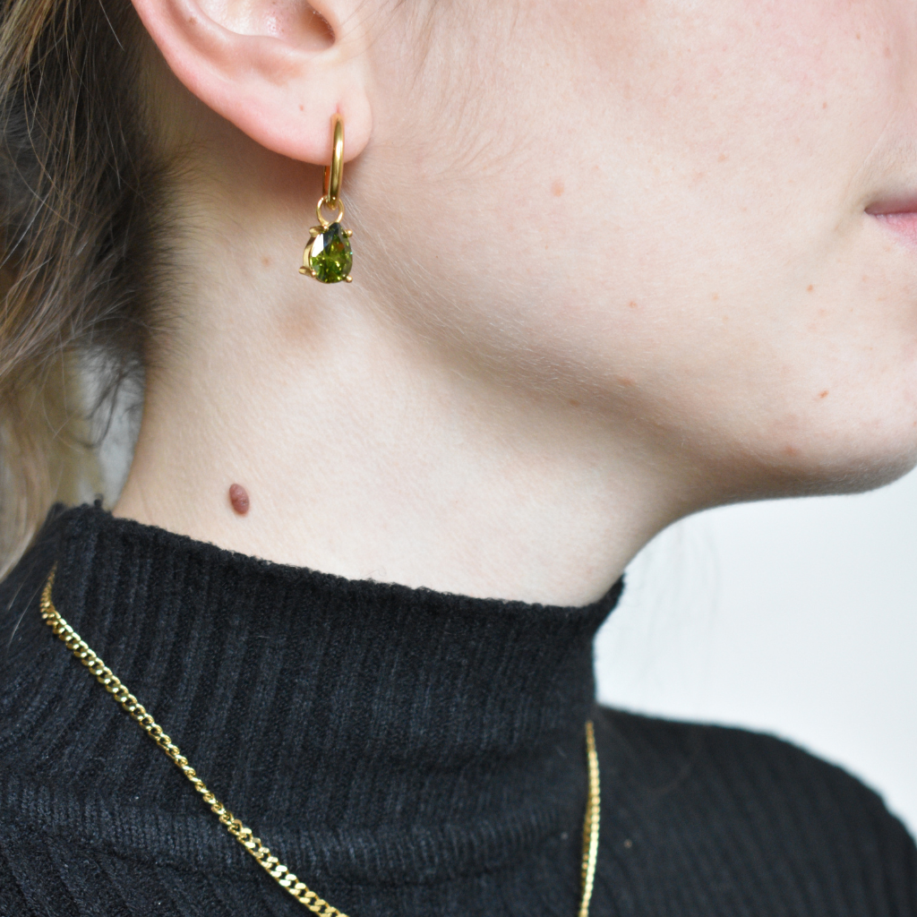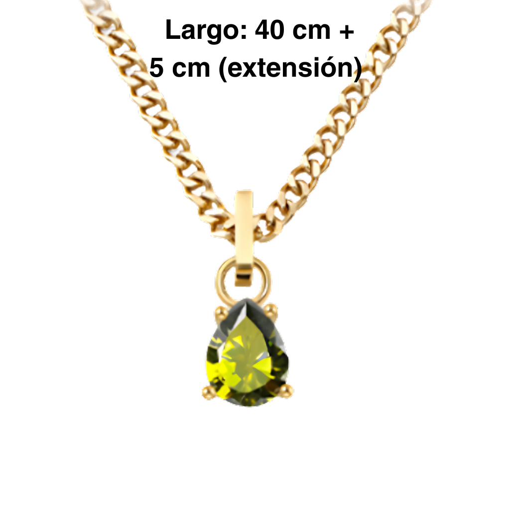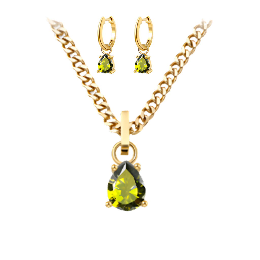 Audaz, elegante y con un carácter único. Este set incluye una cadena de 40 cm + 5 cm de extensión y aros de 2,5 cm, ambos bañados en oro y decorados con un cristal en tono verde oliva en forma de gota, que destaca por su profundidad y sofisticación.
