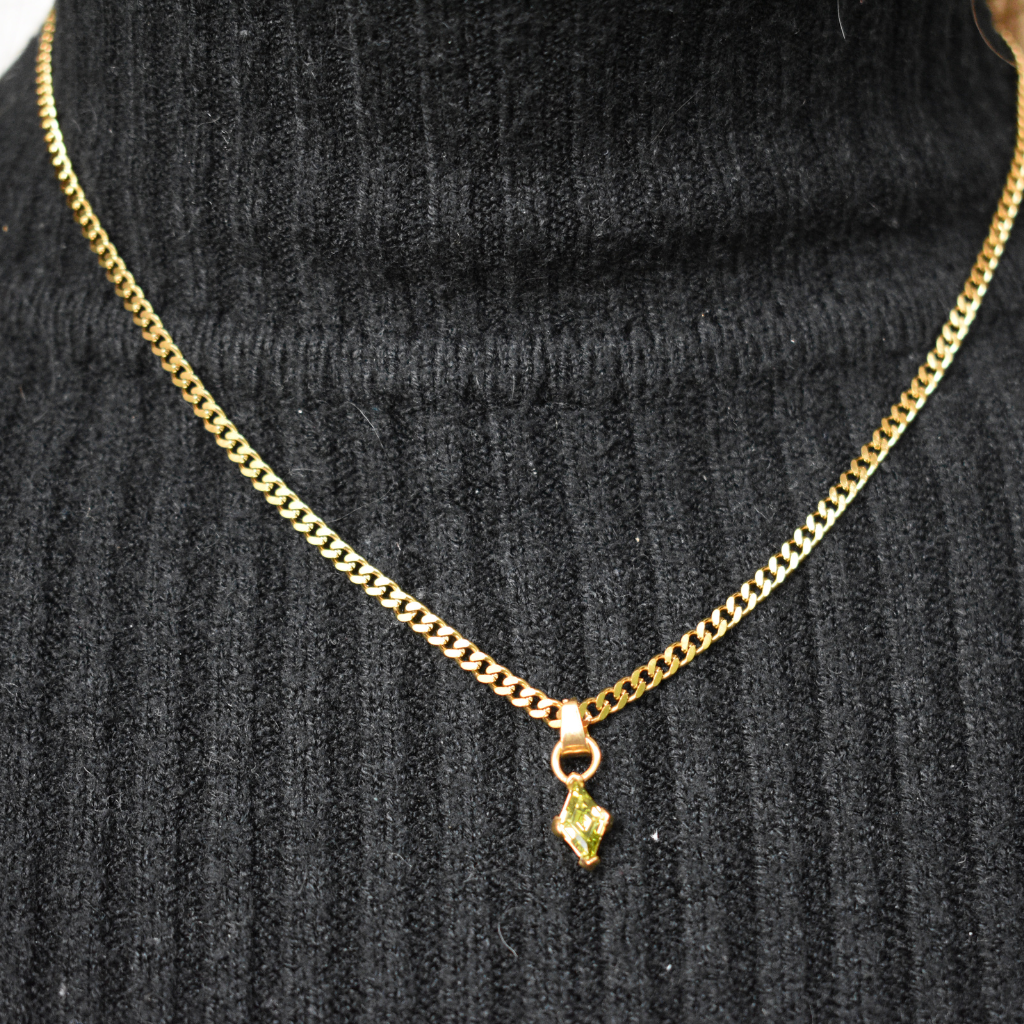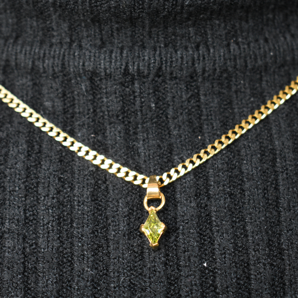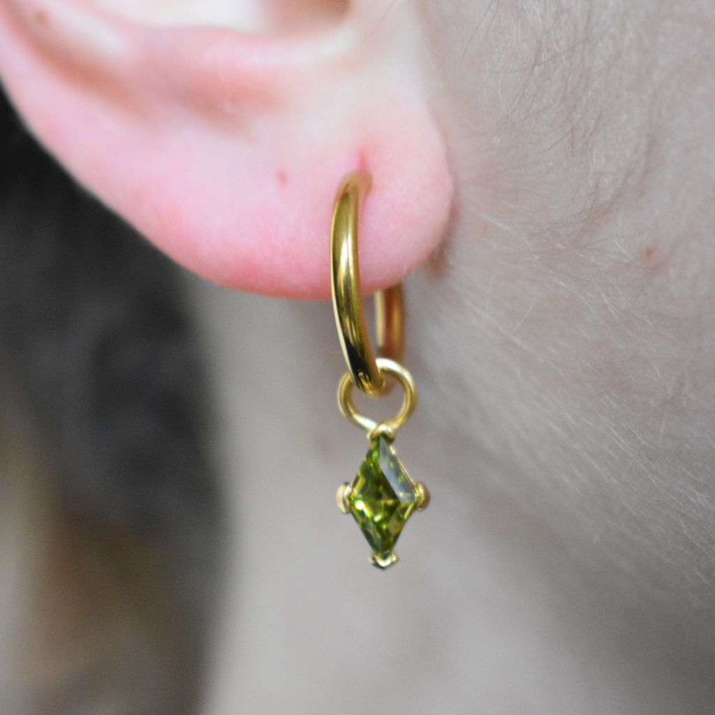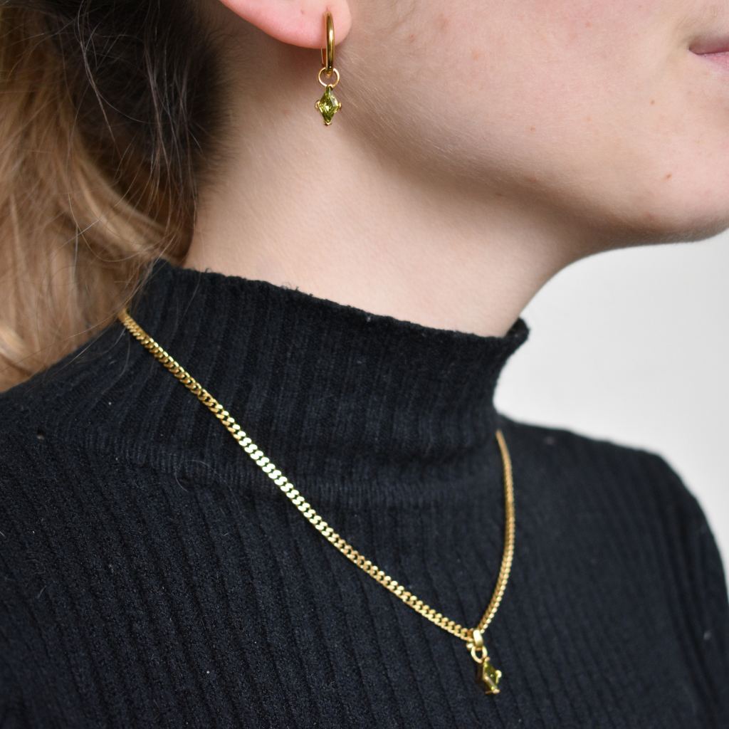 Audaz, elegante y con un carácter único. Este set incluye una cadena de 40 cm + 5 cm de extensión y aros de 2,5 cm, ambos bañados en oro y decorados con un cristal en tono verde oliva en forma de gota, que destaca por su profundidad y sofisticación.