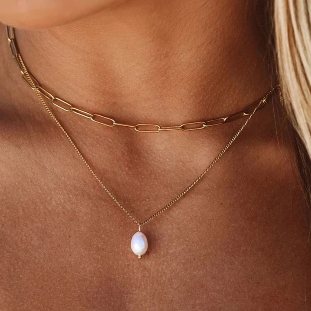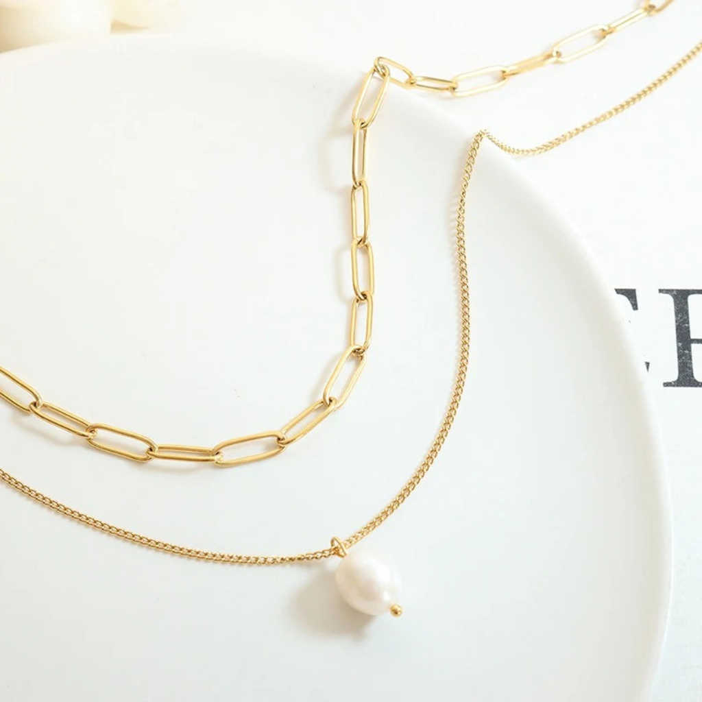 Un dúo perfecto para elevar cualquier look. Combina una cadena de eslabones alargados estilo paperclip con una cadena fina que lleva una perla natural al centro. Minimalista, moderna y hecha para usar todos los días.