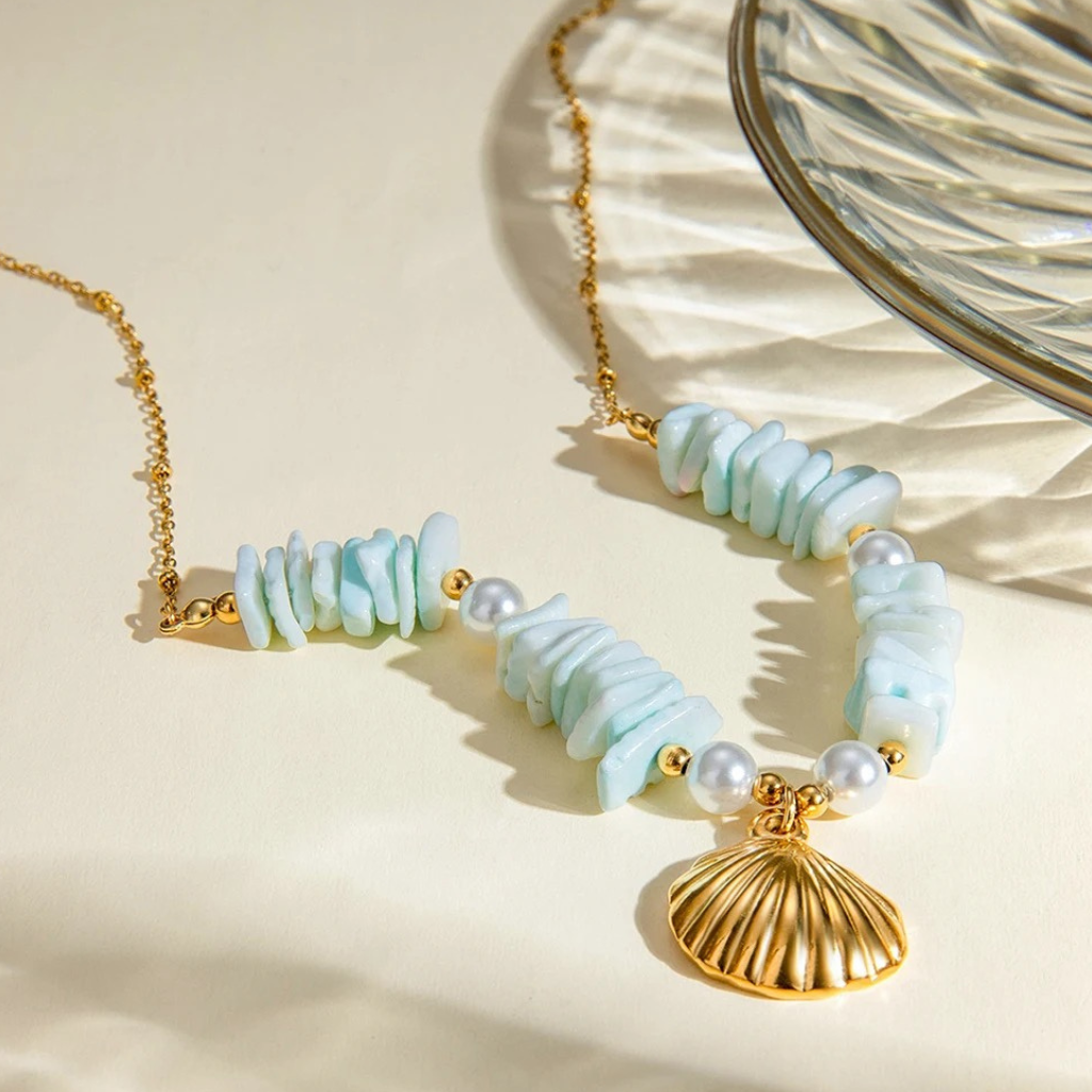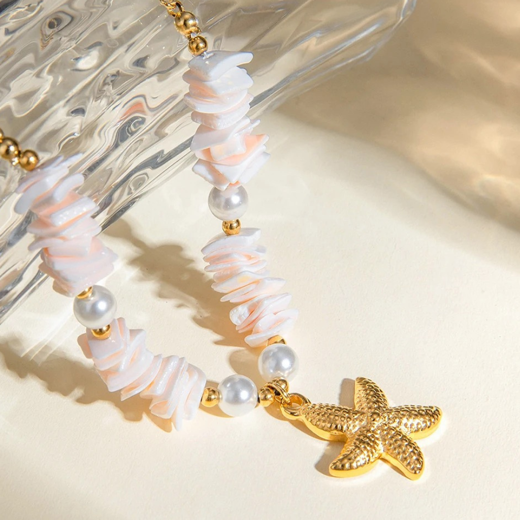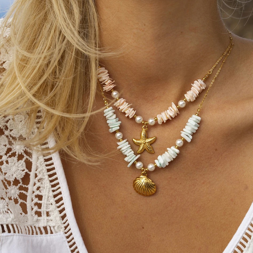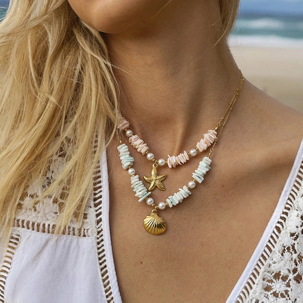 El primer collar mezcla tonos coral claros con perlas, mientras que el segundo incorpora turquesa suave con perlas y un dije dorado en forma de concha y estrella de mar. Juntos crean un look playero, luminoso y lleno de movimiento.