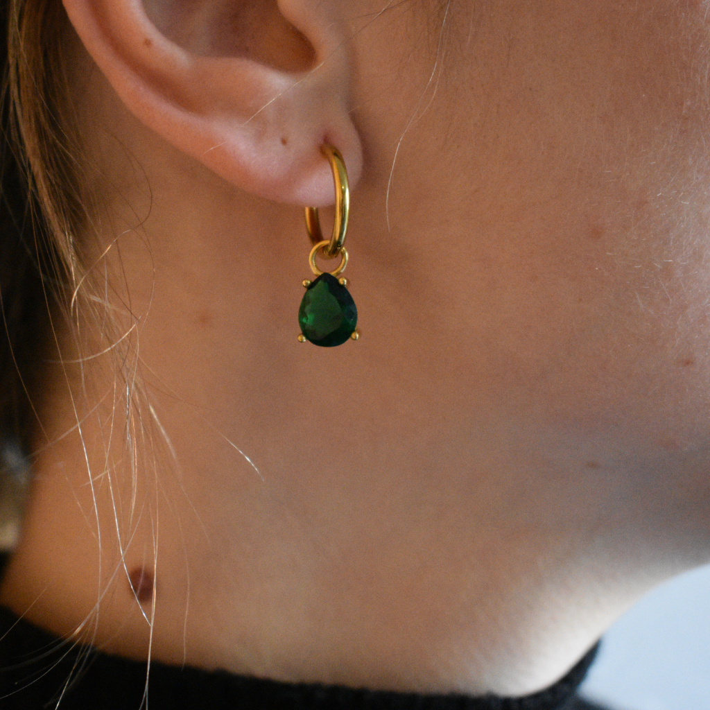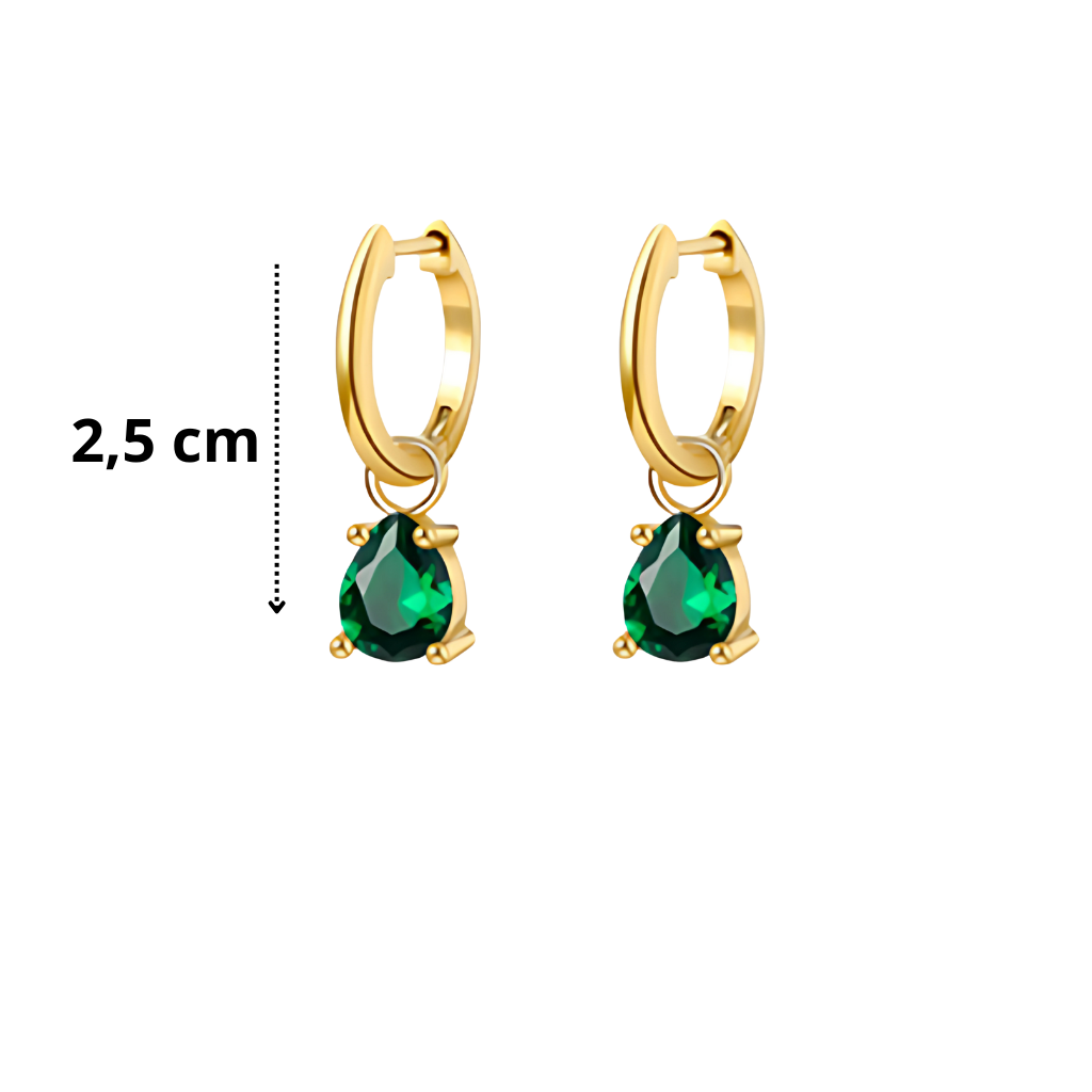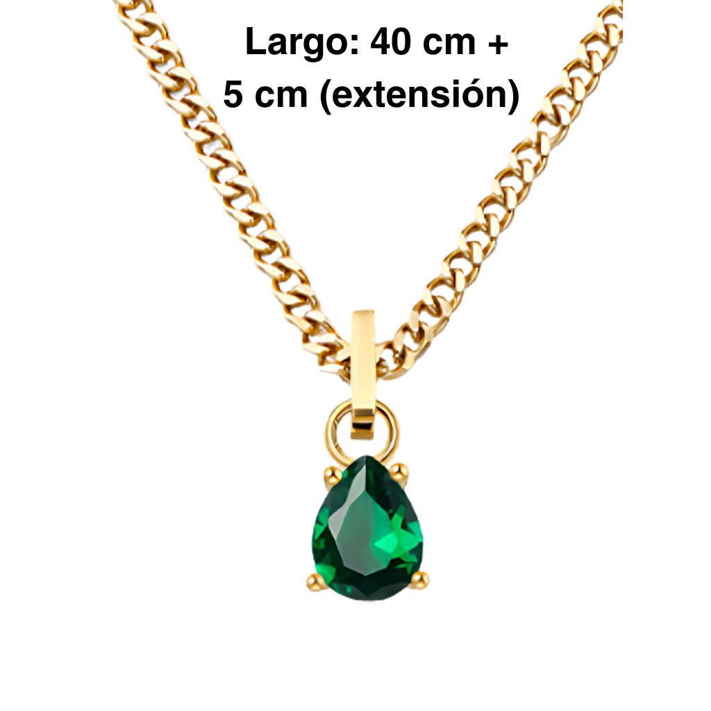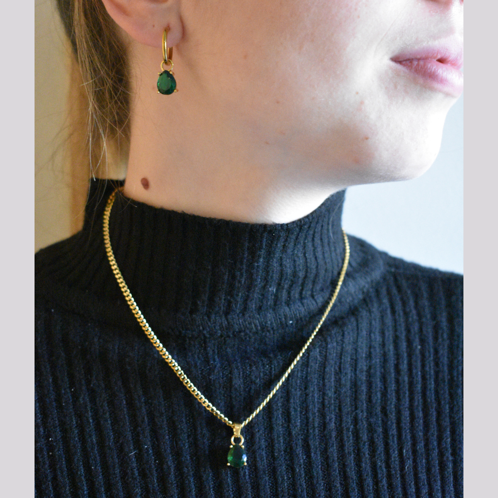 Audaz, elegante y con un carácter único. Este set incluye una cadena de 40 cm + 5 cm de extensión y aros de 2,5 cm, ambos bañados en oro y decorados con un cristal en tono verde oliva en forma de gota, que destaca por su profundidad y sofisticación.
