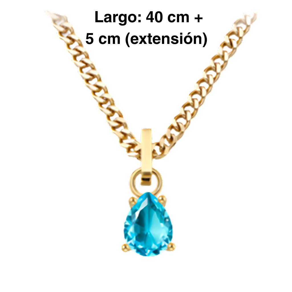 Inspirado en la frescura del mar y la claridad del cielo, este set incluye una cadena de 40 cm + 5 cm de extensión y aros de 2,5 cm, ambos bañados en oro y realzados con un cristal azul cielo en forma de gota que aporta un toque vibrante y refrescante a cualquier look.