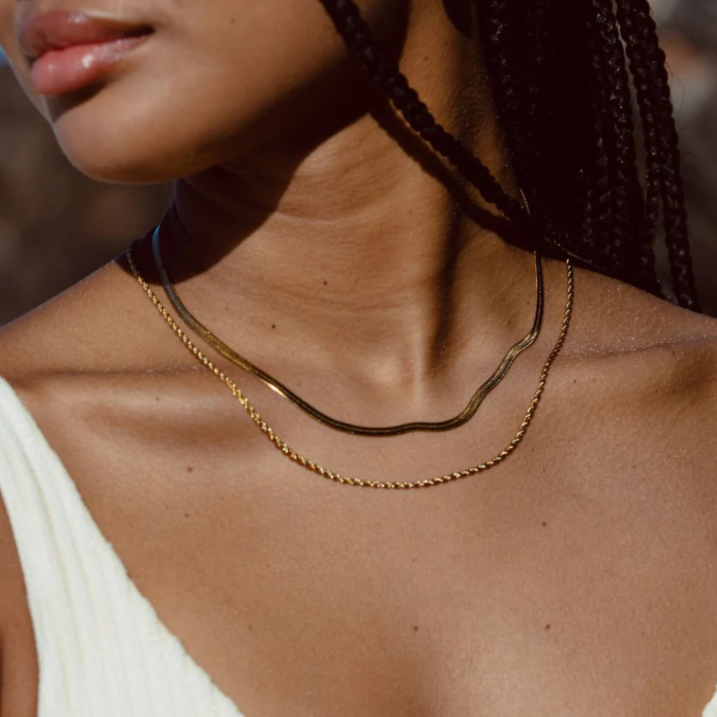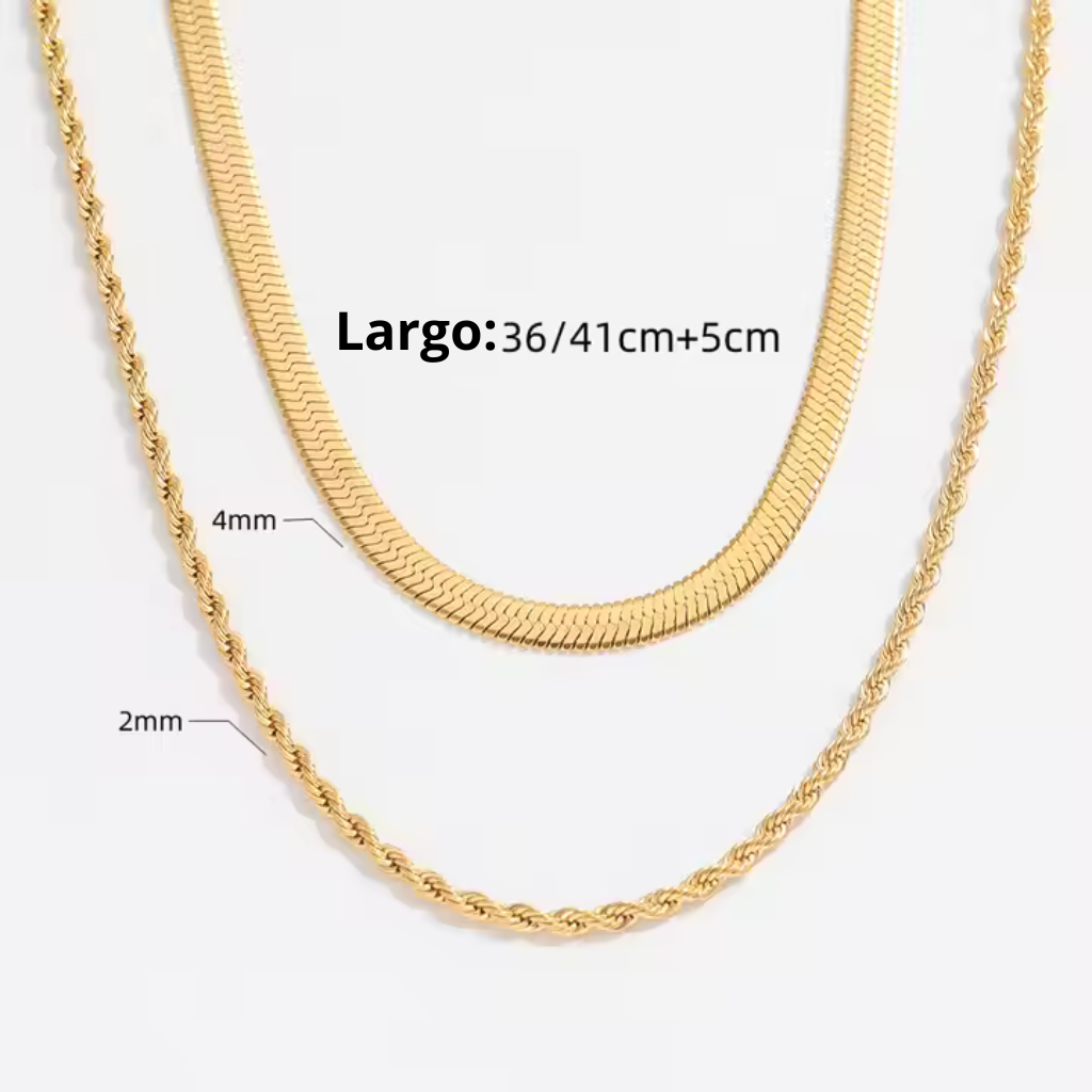 Brilla sin esfuerzo con nuestro nemesius —best seller—: un collar en capas de dos cadenas que ilumina cualquier look. Combina una gargantilla herringbone dorada con una cadena trenzada (rope) de largo medio. Pensado para uso diario: no tendrás que quitártelo ni para la ducha, la piscina o el entrenamiento.