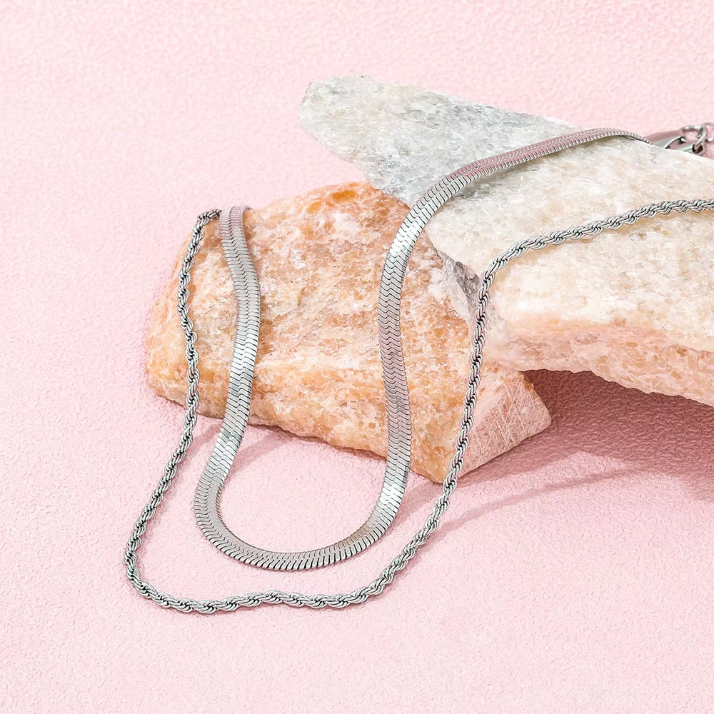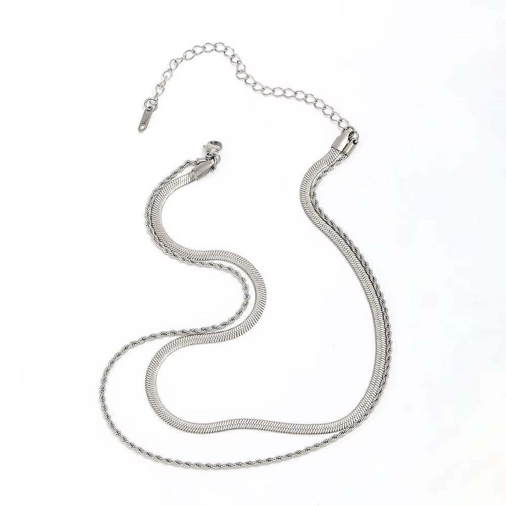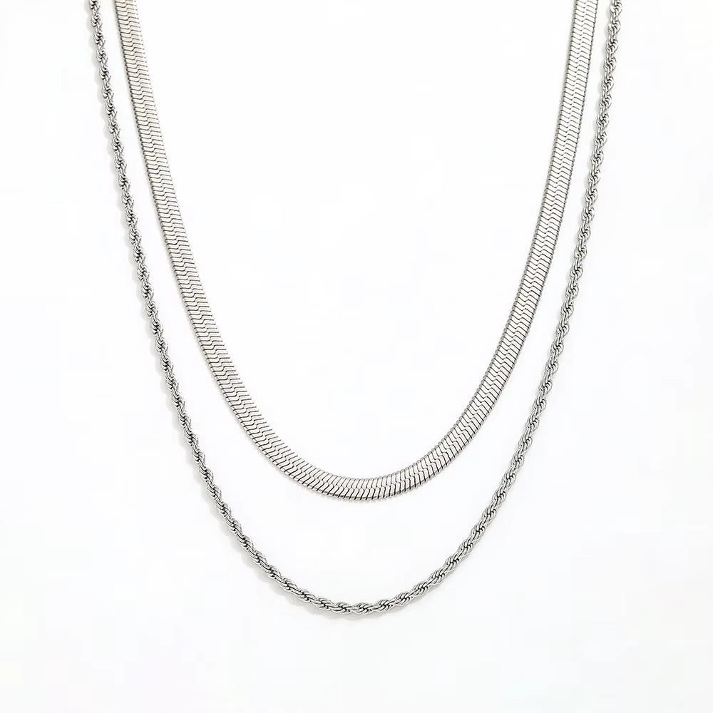 Este conjunto de dos collares combina elegancia y versatilidad. El diseño incluye una delicada cadena trenzada y una moderna cadena plana tipo "herringbone", ambas en un acabado dorado brillante que complementa cualquier tono de piel. Diseñados para resistir el agua, estos collares son ideales para el uso diario, aportando un toque sofisticado a cualquier atuendo, desde un look casual hasta un estilo más formal. Perfectos para quienes buscan accesorios duraderos y con estilo atemporal.