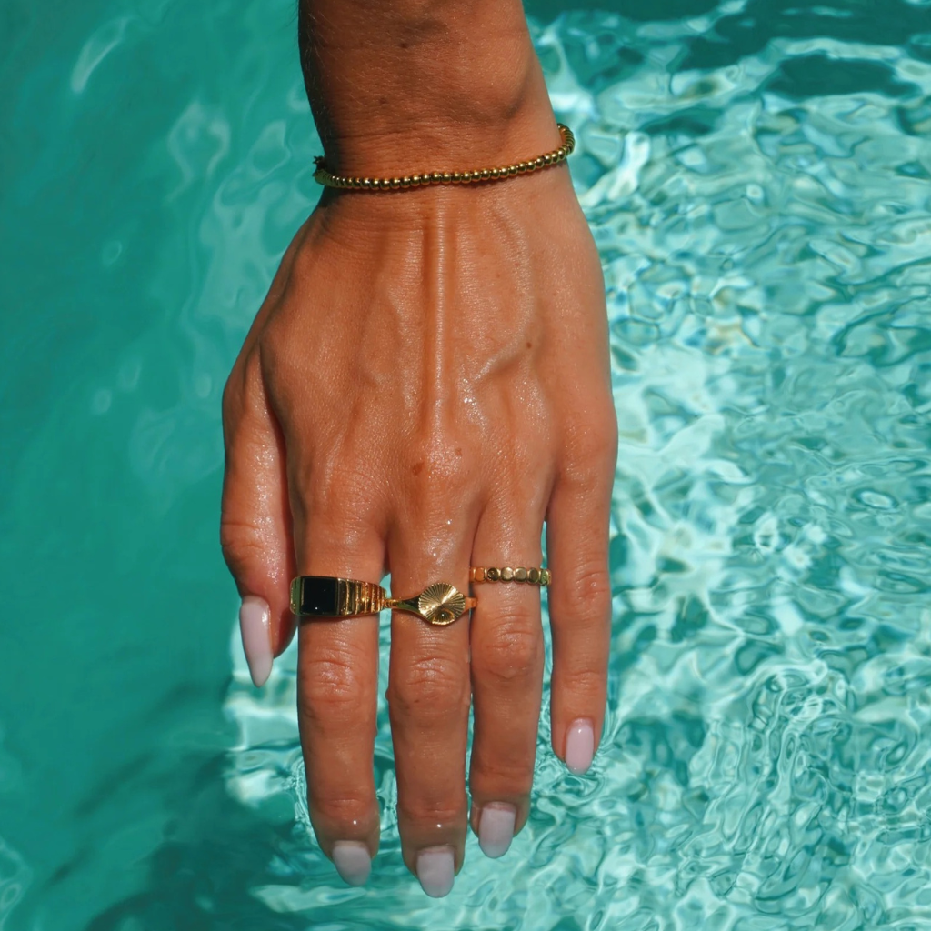 100% waterproof: úsala en la ducha, piscina, gimnasio o playa sin preocuparte. Nuestras joyas no pierden su brillo ni se desgastan con el tiempo.