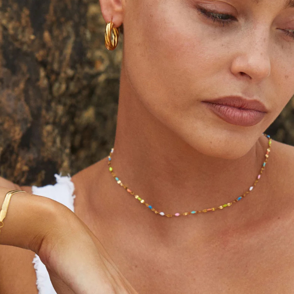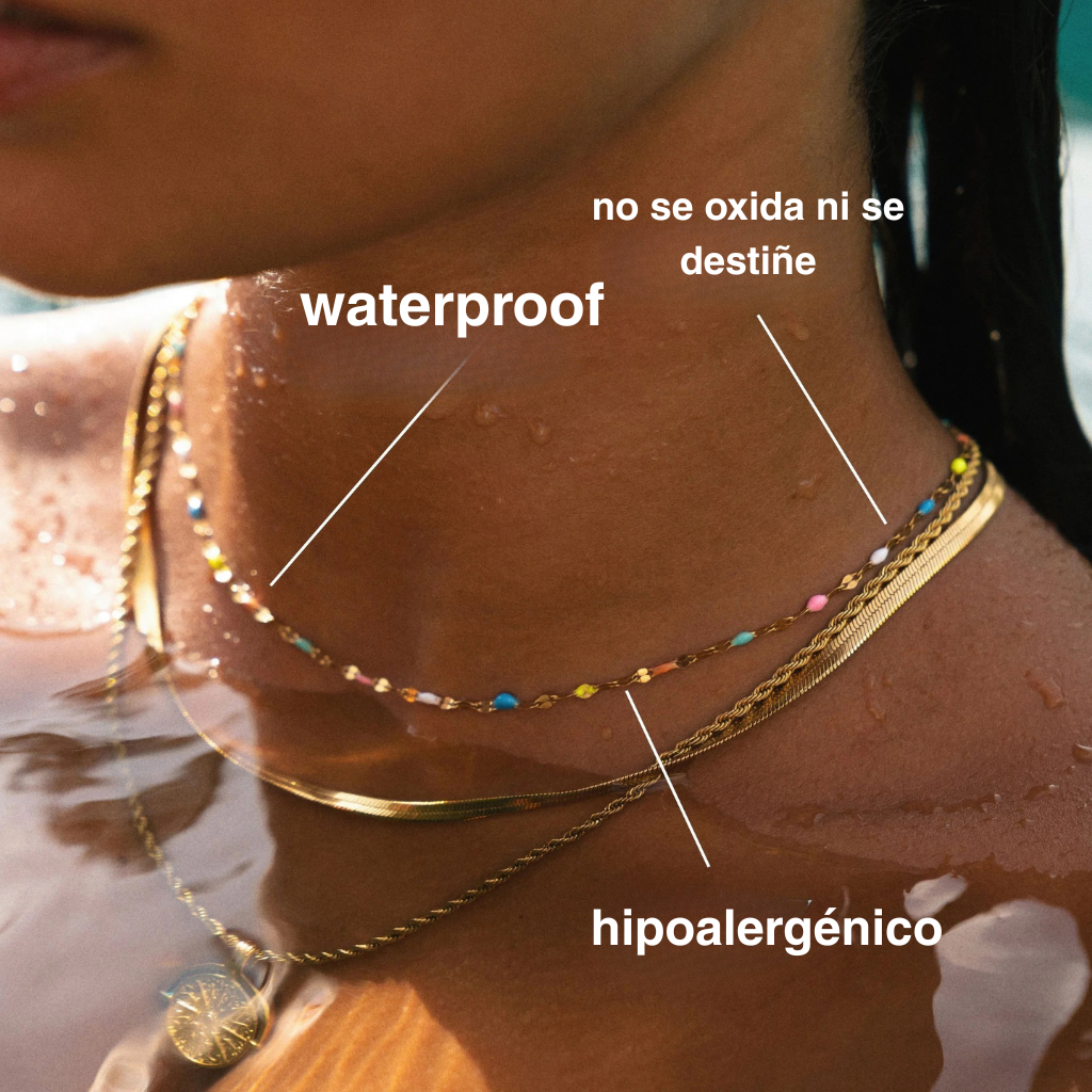 100% waterproof: úsala en la ducha, piscina, gimnasio o playa sin preocuparte. Nuestras joyas no pierden su brillo ni se desgastan con el tiempo.