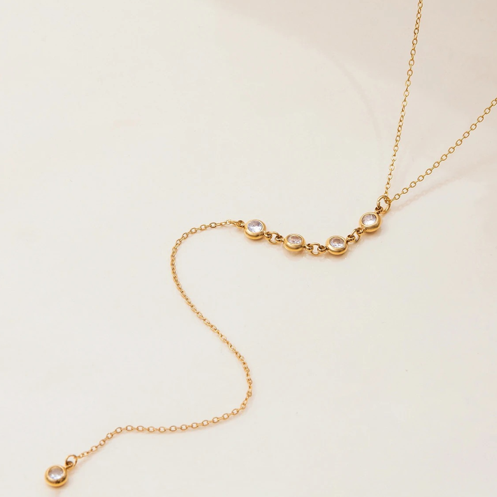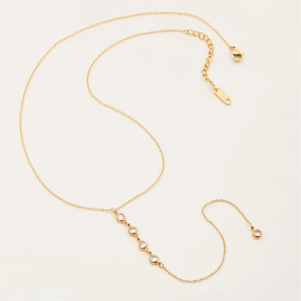 El Collar Roma destaca por su caída estilo “Y”, con cinco circonias engarzadas que capturan la luz en cada movimiento. Su terminación alargada aporta un toque elegante y estilizado al cuello y escote, convirtiéndolo en la pieza ideal para ocasiones especiales o para elevar cualquier look del día a día.