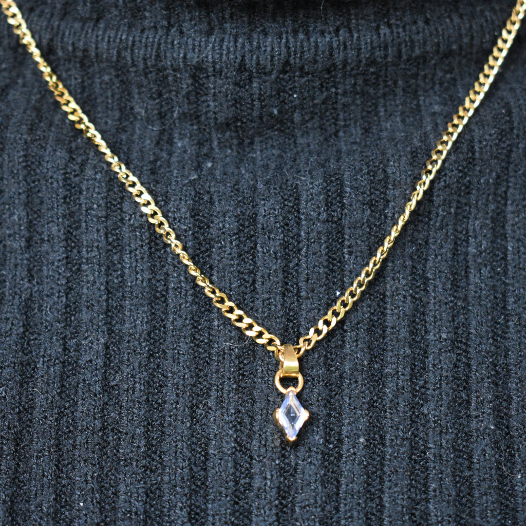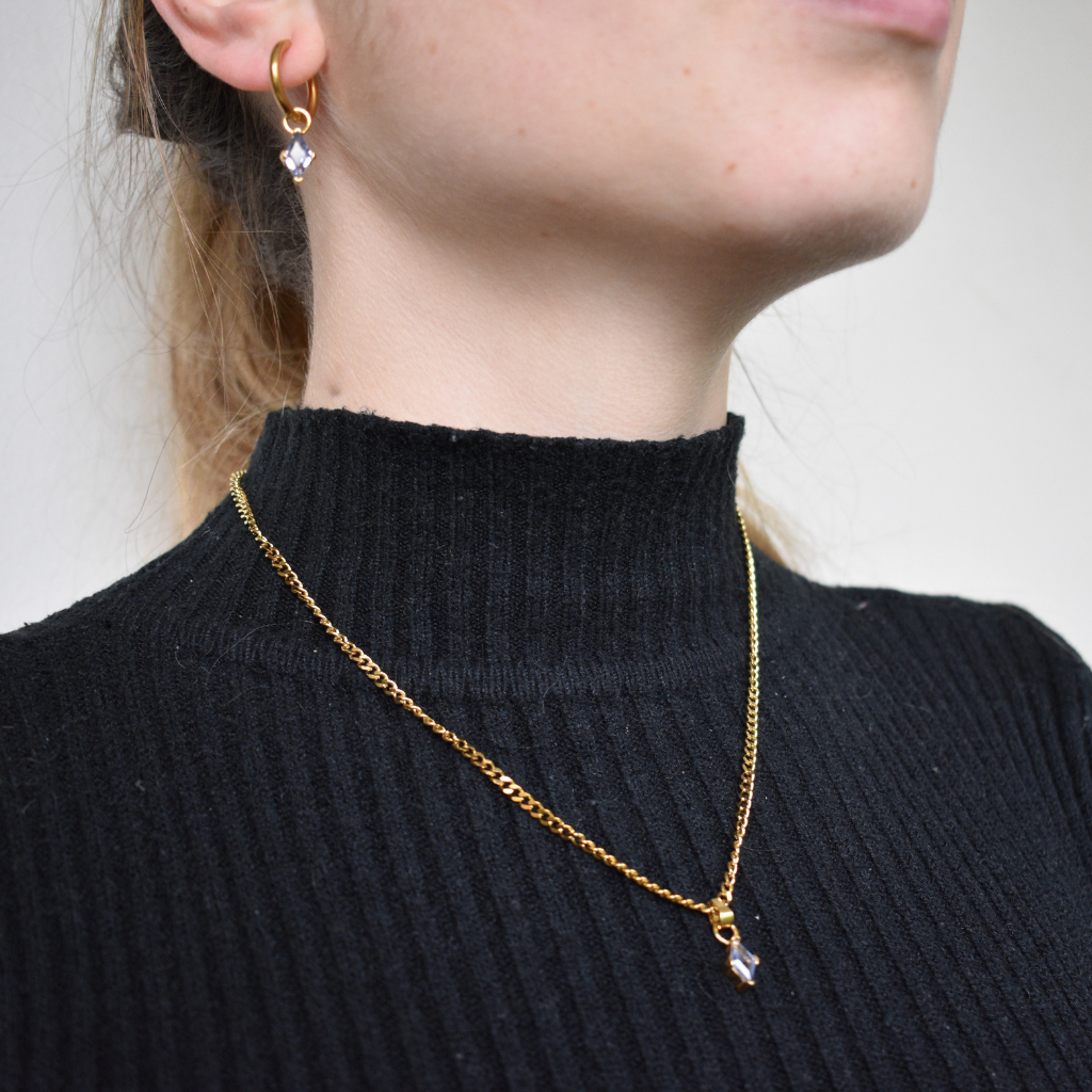 Audaz, elegante y con un carácter único. Este set incluye una cadena de 40 cm + 5 cm de extensión y aros de 2,5 cm, ambos bañados en oro y decorados con un cristal en tono verde oliva en forma de gota, que destaca por su profundidad y sofisticación.