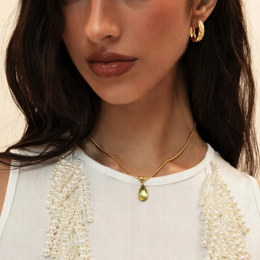 Su colgante en forma de gota refleja la luz con un brillo hipnótico, colgando delicadamente de una cadena fina que aporta elegancia y sutileza a cualquier look.